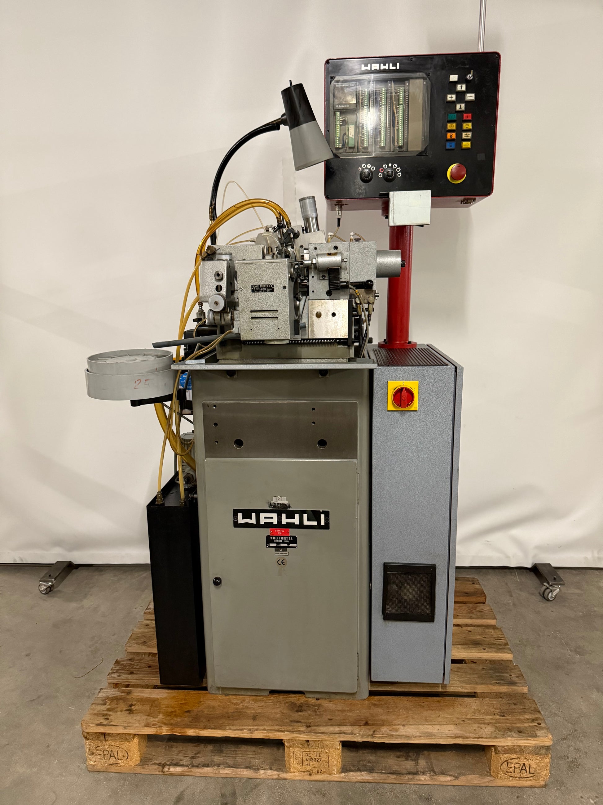 WAHLI W 92 est une Tailleuse par génération précise, haute précision et fiable. Domaine de travail: Ø max 10 mm, module max 0,5, longueur pièce max 35 mm, largeur roue max 15 mm, dents 6–180, distance pièce‑outil 0–28 mm, fraise Ø max 24 mm. Caractéristiques: vitesses fraise 6 étages 850–4500 t/min; branchement 50 Hz 3x380 V; puissance 0,32 CV; poids env. 350 kg; encombrement L630×l530×H1350 mm. Accessoires: commande PLC, chargeur Wahli W20, collecteur de pièces, ébavureur, dispositif d'arrosage, graissage central. Permet des tolérances serrées; secteurs: automobile, horlogerie, outillage, aéronautique, médical.