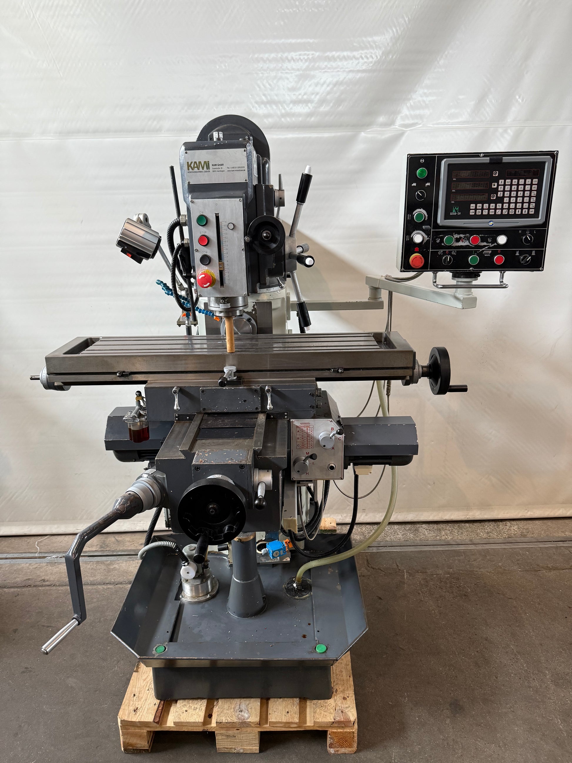 KAMI FKM 560 HSA II est une fraiseuse universelle conçue pour offrir grande précision, haute exactitude et fiabilité constante. Capacités: table 1120×260 mm; courses X 600 mm, Y 300 mm, Z 350 mm; course de broche 120 mm; perçage acier 40 mm; tête inclinable ±90°. Caractéristiques: cône broche ISO 40, vitesses 67–2010 t/min; moteur 2,2 kW; alimentation 3×400 V 50 Hz; poids ≈1300 kg; encombrement L1580×l1450×H2150 mm. Accessoires: affichage numérique 3 axes, jeu de pinces, jeu de porte-outils, armoire à outils et lampe. Assure tolérances serrées; adaptée à l'automobile, l'horlogerie, la construction de machines, l'aérospatial et le médical.