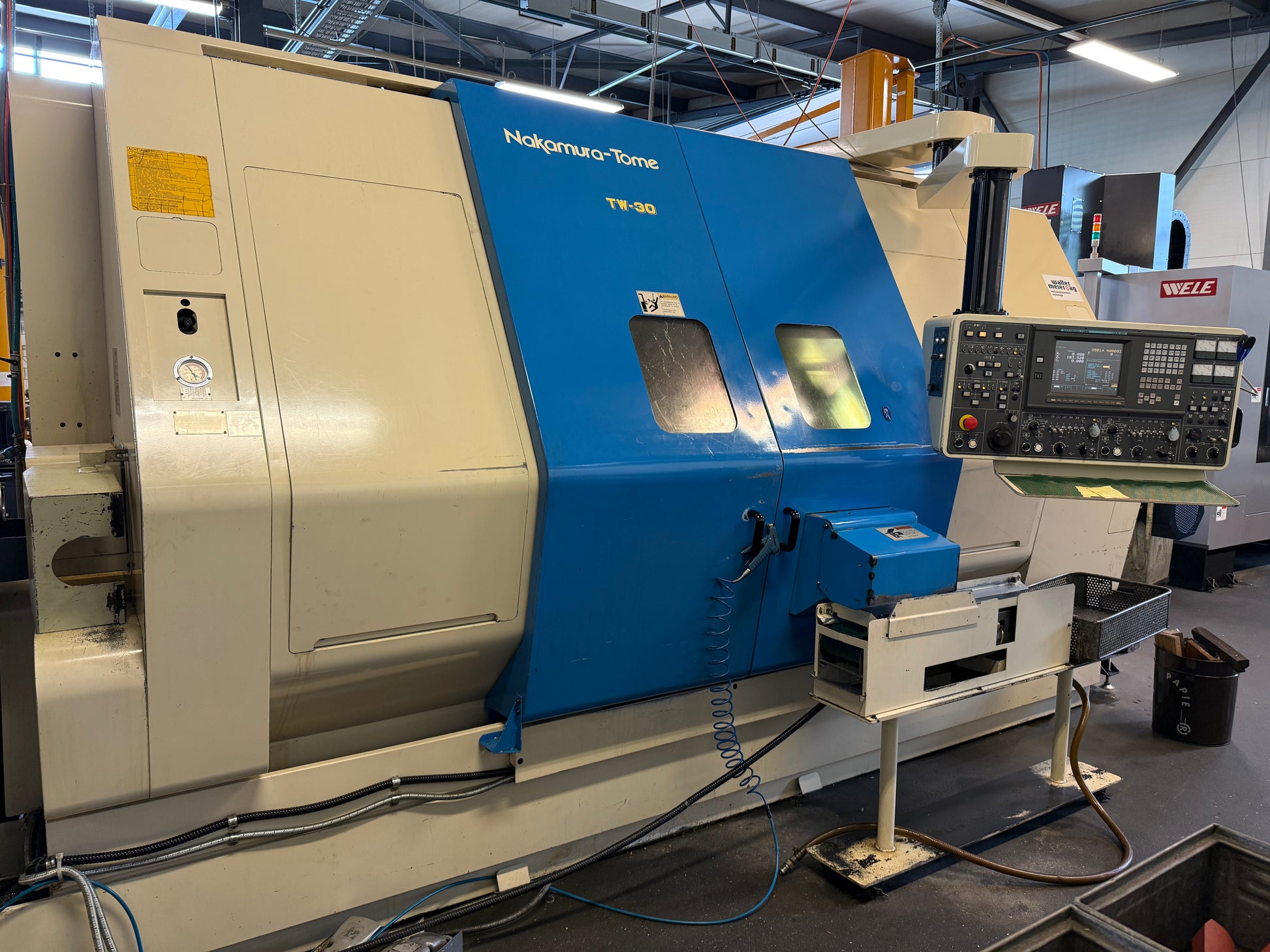 NAKAMURA-TOME TW-30 est un centre de tournage/fraisage CNC à deux poupées, conçu pour précision, haute exactitude et fiabilité. Capacités: 6 axes; distance 1300 mm; Ø max 335 mm; alésage 71 mm; longueur 300 mm; courses Z 350/980, X 265/265 mm; 2 revolvers ×12 outils entraînés. Caractéristiques: 3600/3500 tr/min; 2×22 kW; 3×400 V 50 Hz; poids ~10800 kg. Accessoires: chargeur LNS Hydrobar Sprint, refroidissement, évacuation copeaux, jeu de pinces. Assure tolérances strictes; adapté automobile, aérospatial, médical.