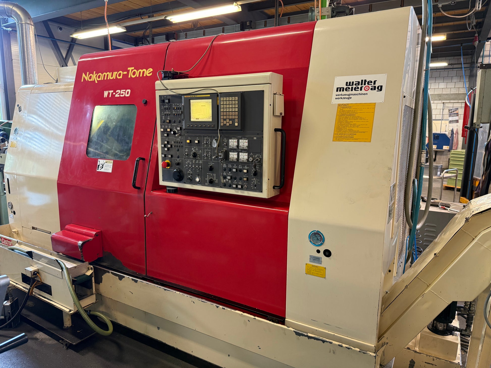 NAKAMURA-TOME WT 250 est un tour CNC à deux poupées, conçu pour une grande précision, haute exactitude et fiabilité. Capacités: longueur de tournage max 555 mm, Ø max 250 mm, passage barre 65 mm; courses Z 600 mm, X 195 mm, Y ±41 mm; 2 revolvers 12 positions. Caractéristiques: 7 axes; vitesses 20–4500 tr/min (val. 3600 tr/min); puissance broche 18.5/15 kW; contre-broche max 5000 tr/min, 11/7.5 kW; axe C rés. 0.001°; 3×400 V 50 Hz; poids ≈6500 kg; encombrement 3500×3000×2200 mm. Accessoires: chargeur Hydro‑Sameca, refroidissement, évacuation copeaux, convoyeur, mandrin 3 mors, jeux de mors, pinces, porte-outils. Idéal pour tolérances serrées en automobile, aérospatial, médical, horlogerie et outillage.