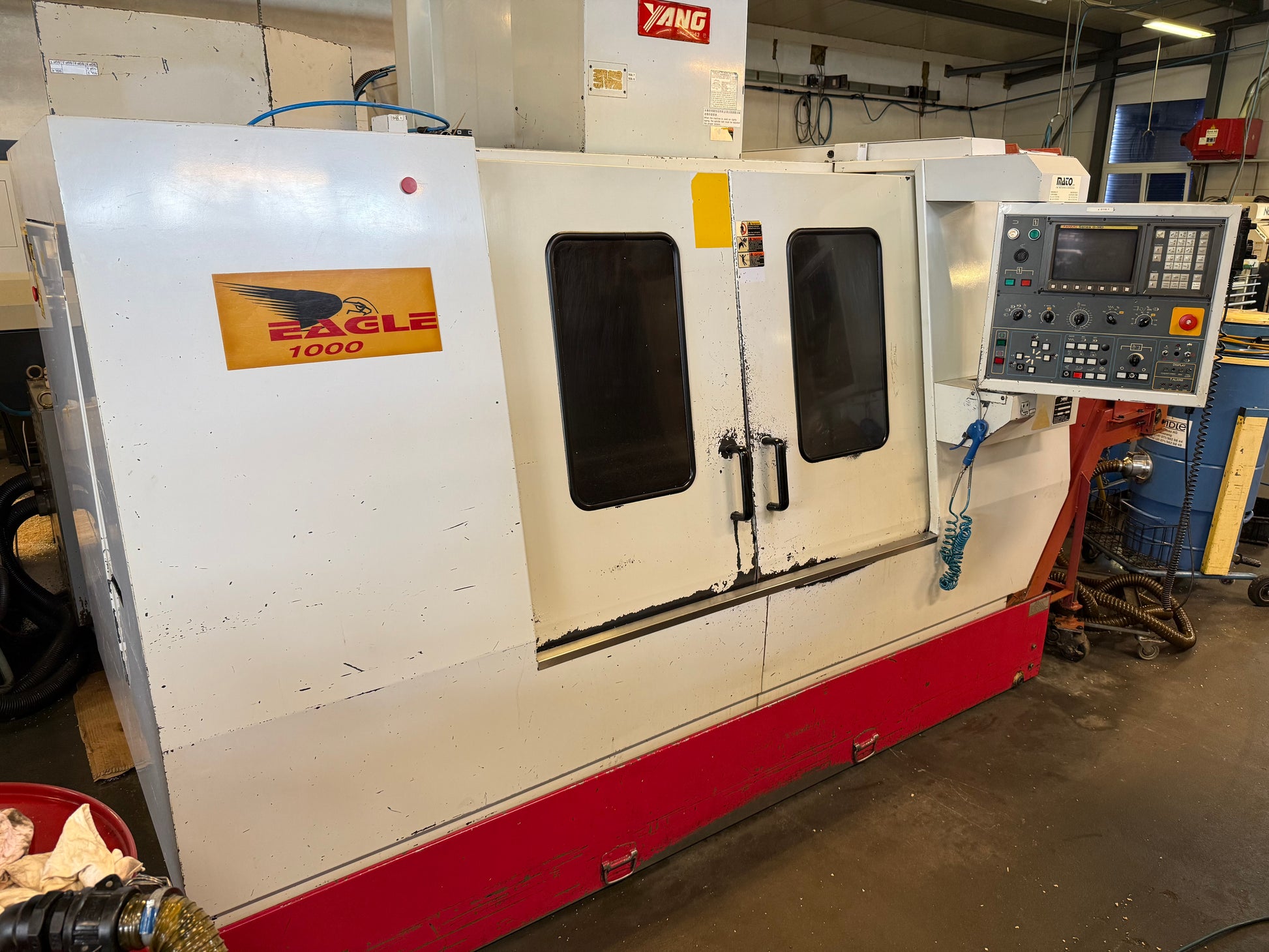 YANG EAGLE 1000 (SMV-1000) est un centre d'usinage vertical pour précision, grande exactitude et fiabilité. 3 axes; table 1070×500 mm; courses X1020 Y510 Z510; charge 350 kg; magasin 20 outils; ISO40; broche 60–6000 t/min, 7,5 kW; 3x400 V; poids 4200 kg; encombrement 2900×2230×2690 mm. Accessoires: porte-outils, arrosage, évacuateur de copeaux. Tolérances serrées; secteurs: automobile, horlogerie, machines-outils, aéronautique, médical.