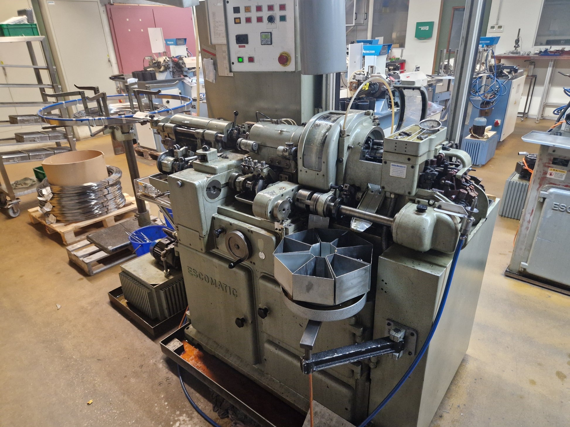 ESCO ESCOMATIC D 6 SR est une décolleteuse, conçue pour grande précision, haute exactitude et fiabilité. Capacités: diamètre matière 6 mm; avec came plate longueur 62 mm; alésage broche 6 mm. Caractéristiques: 3 vitesses broche 2400–6000 t/min; 3 burins; revolver 1a (D6-8-Mp 103/a) 4 outils; alimentation 220/440 V (60Hz); puissance 2.5 CV; poids ~1150 kg; dimensions L1500×l1000 mm. Équipement: tourelle revolver. Permet tolérances serrées; secteurs: automobile, horlogerie, outillage, aéronautique, médical.