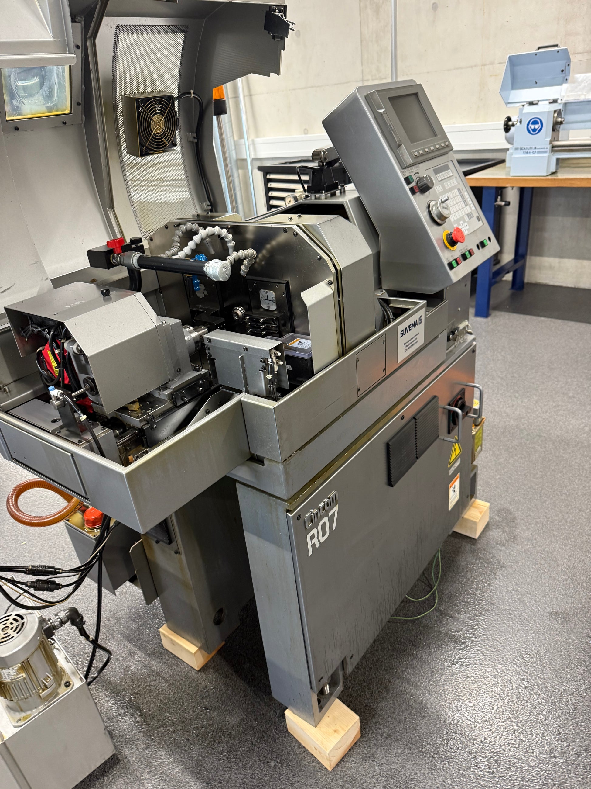 CITIZEN CINCOM R 07 VI è un tornio automatico CNC tipo Swiss di elevata precisione, con alta accuratezza e grande affidabilità. Capacità: 6 assi, 2 mandrini; diametro tornibile max 7 mm, lunghezza max 40 mm, passaggio mandrino 12 mm; filettatura fino a Ø4 M, lunghezza taraudatura 40 mm. Specifiche tecniche: mandrino 0–16.000 t/min, potenza 1,1 kW; contromandrino fino 10.000 t/min, 0,5 kW; risoluzione asse C 1°; alimentazione 3x400 V 50 Hz, potenza installata 4 kVA; peso ~950 kg; ingombro 1465×560×1410 mm. Accessori: raccoglitore pezzi, lampada, avanzamento barra LNS TRYTON 107, lubrificazione centralizzata, luce di stato. Ideale per ottenere tolleranze strette; settori tipici: automotive, orologeria, medicale, aerospaziale, utensili macchina
