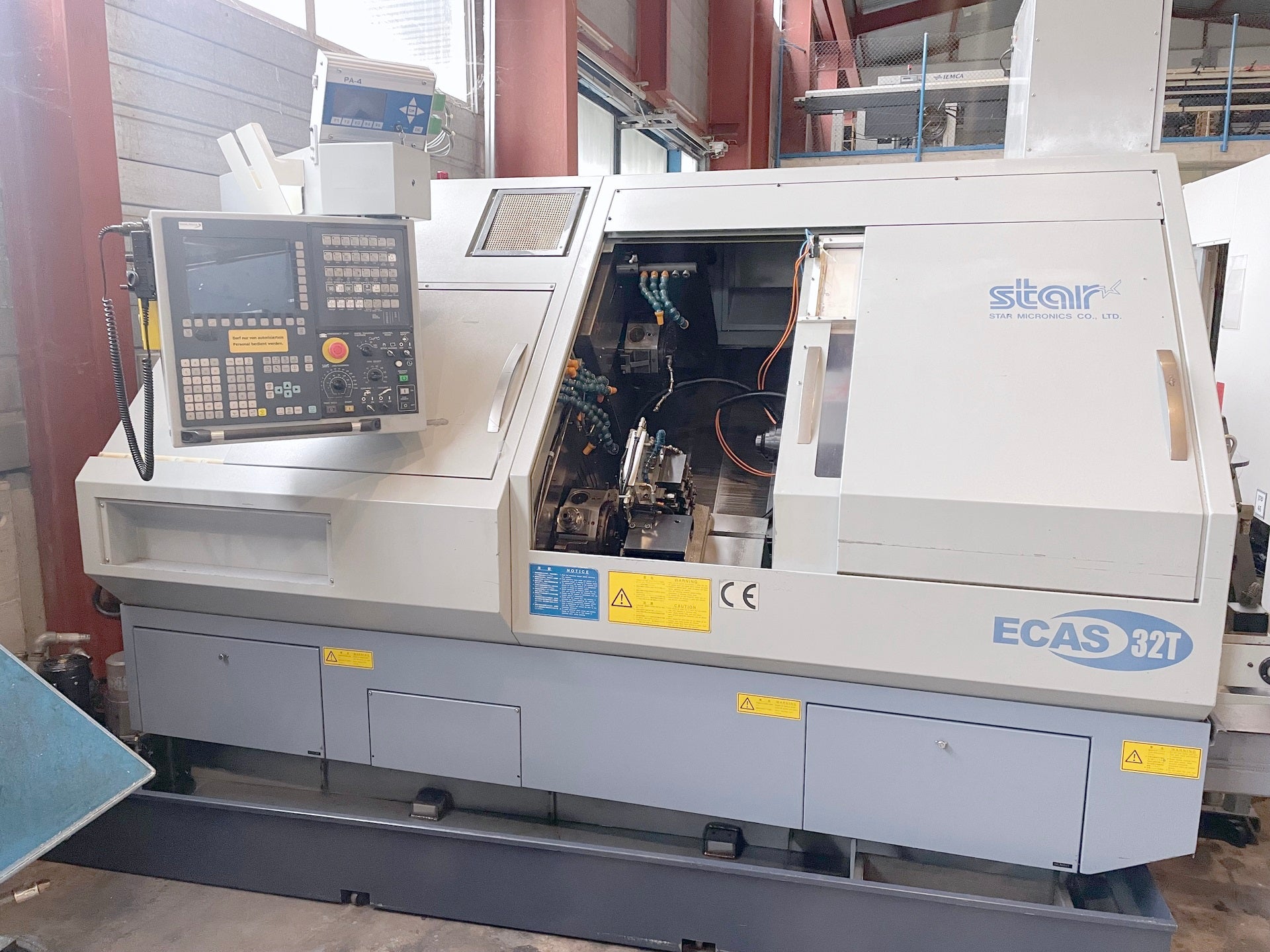 STAR ECAS 32 T is a CNC automatic lathe (CNC Swiss type) engineered for high-precision, high-accuracy and reliable production. Working capacities: 4 axes, 2 spindles, turning length 350 mm, max. bar diameter 32 mm, C-axis on spindle and back spindle, spindle speeds up to 7000 rpm; upper/lower turret 10 tools each, 2 driven tools each (5700 rpm). Technical specs: 50 Hz 3x400 V supply, spindle motor 7.5 kW, back spindle 3.7 kW, total power 8 kVA, machine weight ~5700 kg, dimensions L3175×W1745×H1860 mm. Accessories: LNS bar feeder Express 332 (max 4000 mm), workpiece loader, set of toolholders, chip conveyor, coolant system. Delivers tight tolerances; ideal for automotive, watchmaking, machine tools, aerospace and medical sectors.