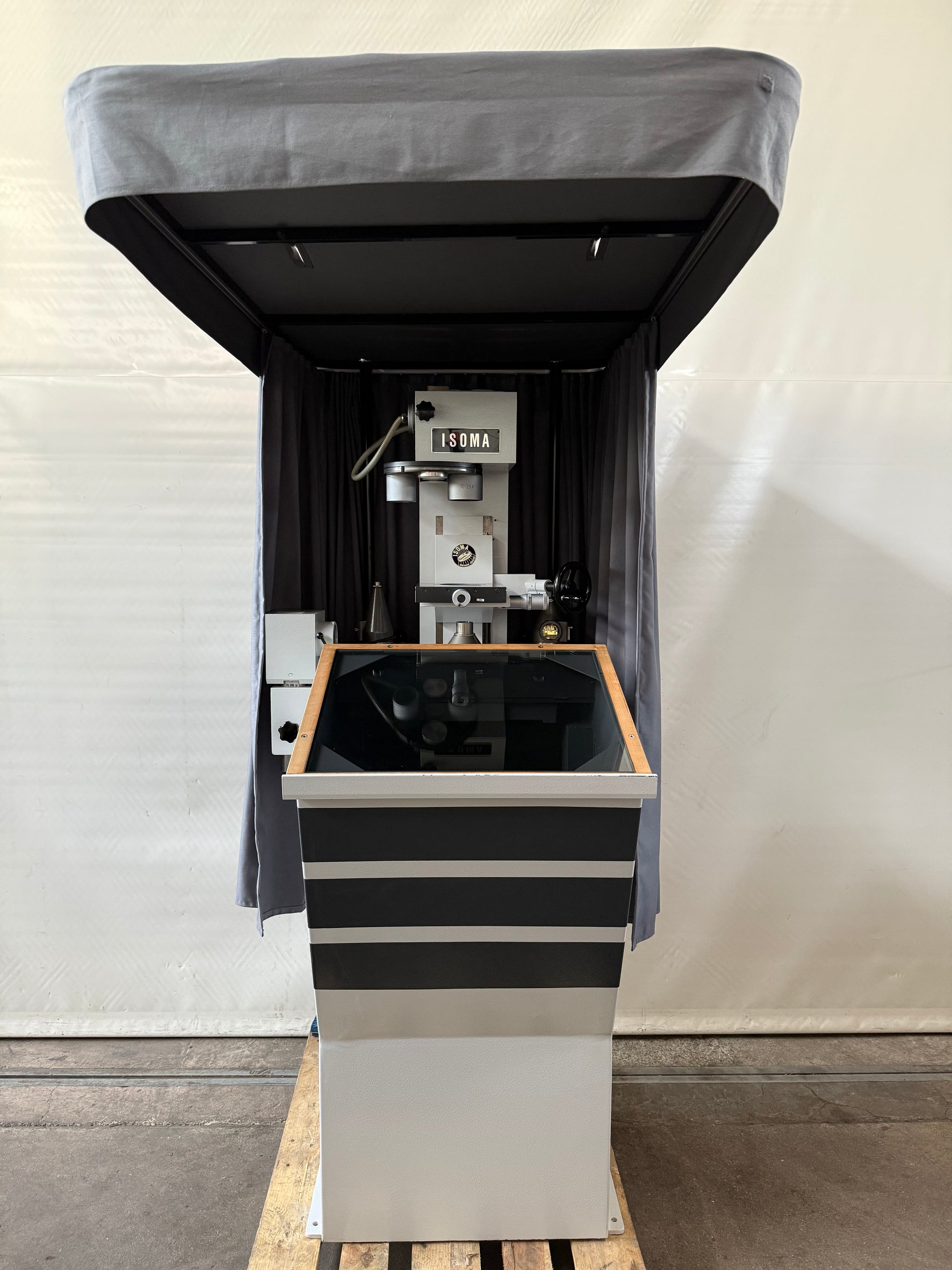 ISOMA 129 Y is a profile projector of high precision, engineered for superior accuracy and reliability. Screen 550×550 mm; microscope stage Ø95 mm; longitudinal travel 200 mm, transverse travel 50 mm; glass table diameter 80 mm; magnifications 10×, 20×, 50×, 100×. Voltage 50 Hz, 3x 220 V; machine weight about 320 kg; overall dimensions L810×W1120×H1760 mm. Fitted with an obscuration device. Enables inspection to tight tolerances; suitable for automotive, watchmaking, machine tools, aerospace and medical sectors.