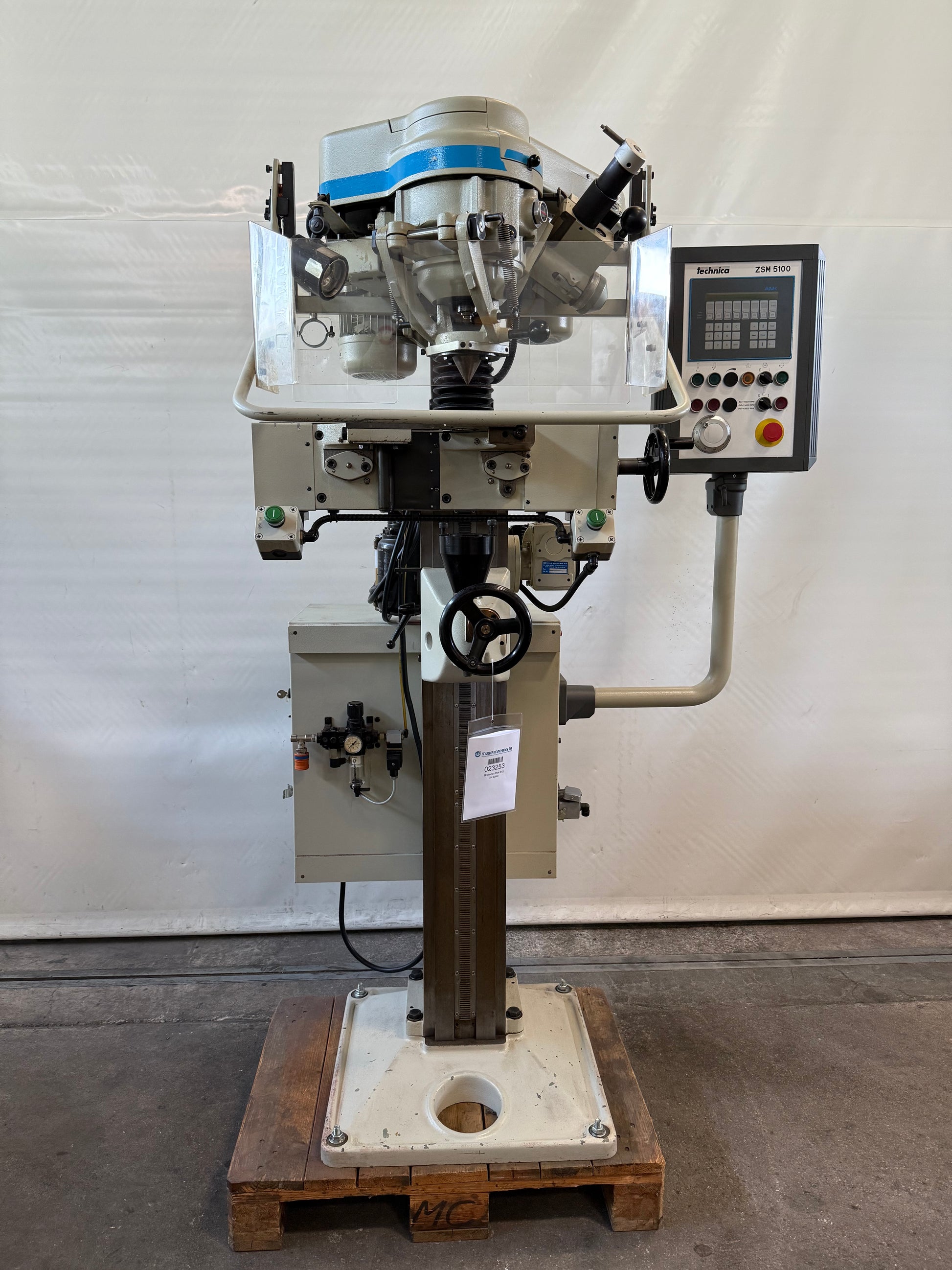 TECHNICA ZSM 5100 is a Centre grinder designed for high precision, accuracy and reliability in centre grinding. Handles workpieces Ø 8–125 mm, lengths 50–1090 mm, table load max 120 kg; centre hole angle 60°; taper Ø 1–60 mm. Grinding spindle Ø 32 mm; wheel speeds Ø15: 45,000 t/min, Ø27: 22,500 t/min, Ø48: 13,000 t/min; spindle power 0.25 kW; max. grinding head traverse 160 mm; voltage 400 V; machine weight ~590 kg; dimensions L1120×W1070×H1950 mm. Accessories: increase/reise 470 mm, dust extraction, machine lamp, security-protection panel. Achieves tight tolerances; suited to automotive, watchmaking, machine tools, aerospace and medical sectors.