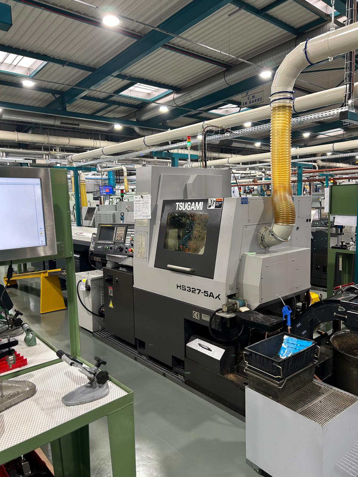 TSUGAMI HS 207-5AX is a CNC automatic lathe / Swiss-type lathe with high precision, excellent accuracy and reliability. 5 axes, 2 spindles; turning diameter 3–20 mm; max turning length 250 mm; internal spindle diameter 20 mm. Spindle speeds 200–10,000 t/min; spindle power 3.7 kW; back spindle 2.2 kW; 35 tools; rapid traverse 32 m/min; power 50 Hz 3x400 V; total installed 14.6 kVA; weight ~3300 kg; footprint 2110×1200×1885 mm. Bar feeder LNS EXPRESS 320. Built to achieve tight tolerances on precision components.