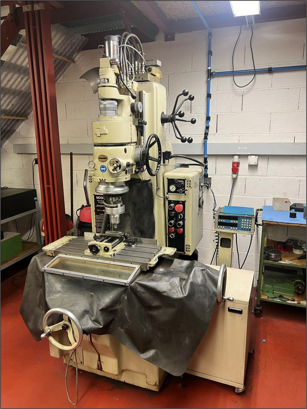 MOORE G 18 is a Jig grinder (coordinate grinder) delivering precision, high accuracy and reliability. Working capacities: table 610×280 mm, travels X 450 mm, Y 280 mm, Z 320 mm, spindle stroke 92 mm, distance spindle‑center to vertical slide 250 mm, max grinding Ø 127 mm (304 mm with plate), spindle nose stroke 340 mm, grinding range 0.4–90 mm. Technical specs: spindle speeds 25–225 t/min, grinding spindle 6,000–175,000 t/min, air 7 bar, power 50 Hz 3x 380 V, weight ~1900 kg, size L2200×W1800×H2600 mm. Achieves tight tolerances; typical in automotive, watchmaking, machine tools, aerospace and medical sectors.